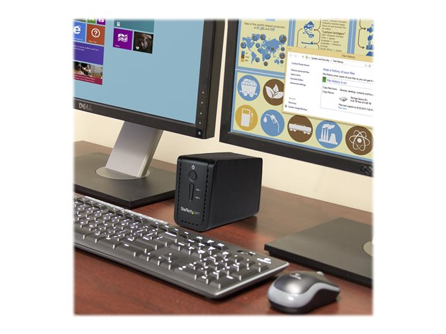 Le boîtier de disque dur à deux baies inclut à la fois un câble USB-C et un câble USB-A pour faciliter sa connexion aux derniers ordinateurs portables et tablettes équipés d'un port USB-C , d'un port USB-C Thunderbolt 3 mais aussi aux appareils plus anciens. Indépendant du système d'exploitation, ce boîtier ne nécessite l'installation d'aucun logiciel ni pilote supplémentaire.