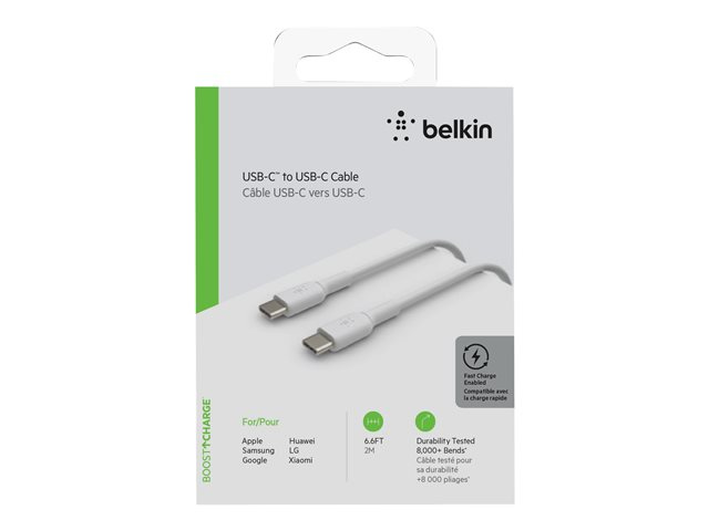 Le Câble Belkin BOOST?CHARGE USB-C vers USB-C vous permet de synchroniser vos photos, votre musique et vos données avec votre ordinateur à des vitesses allant jusqu'à 480 Mbps. Le Belkin CAB003 prend également en charge jusqu'à 3 A de puissance de sortie pour charger vos appareils USB-C.