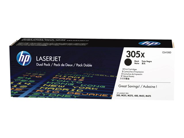 Les lots de deux cartouches de toner HP LaserJet 305X d'origine offrent une qualité d'impression professionnelle plus économique que les cartouches individuelles. Imprimez et économisez davantage. Restez productifs et réduisez les temps d'arrêt en conservant une cartouche de toner supplémentaire à proximité.